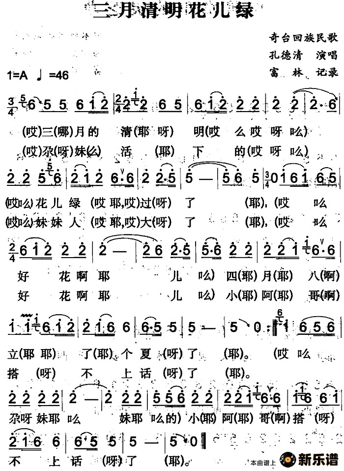 演唱的三月清明花儿绿歌词,三月清明花儿绿简谱.