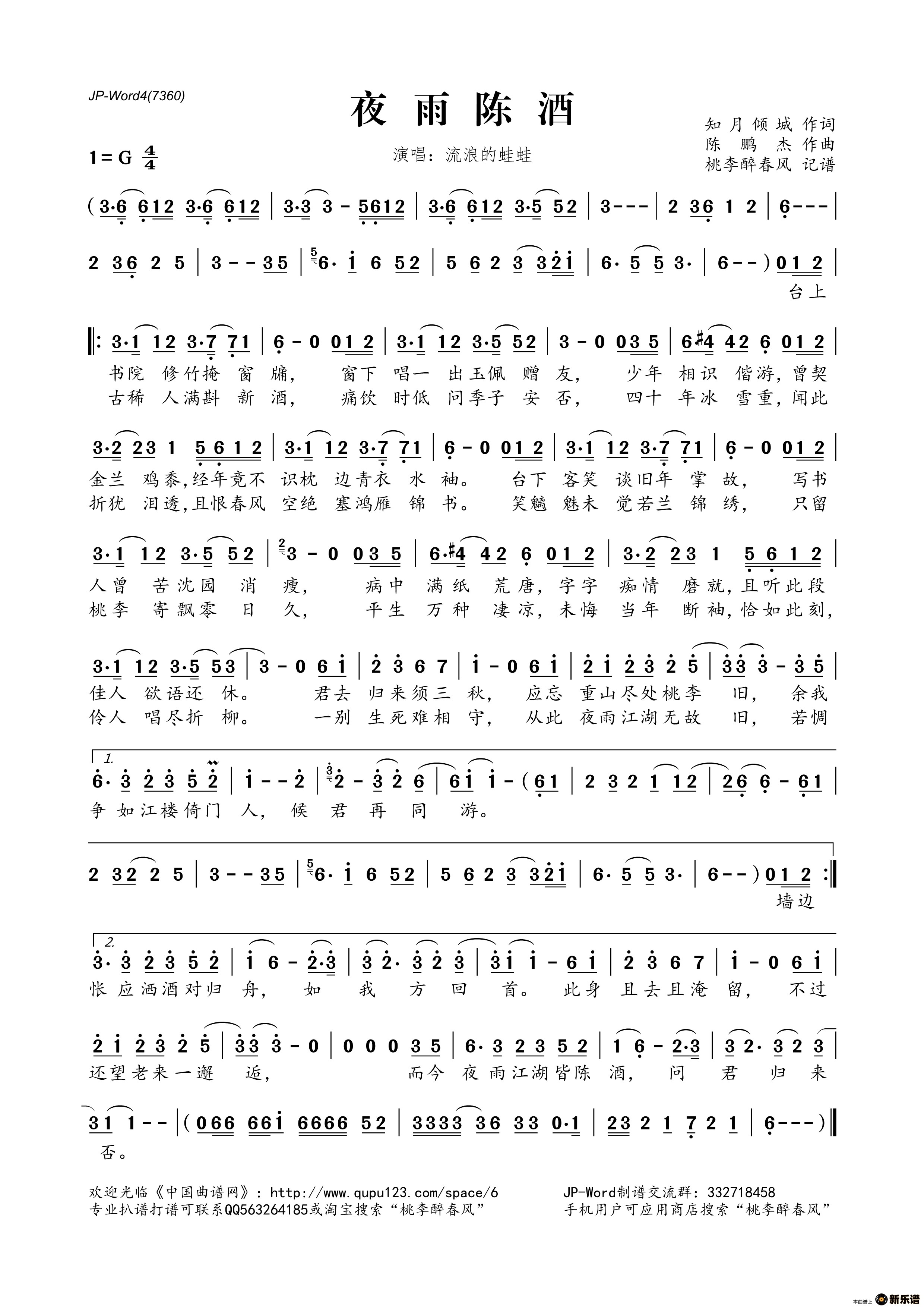 《夜雨陈酒》简谱 流浪的蛙蛙-桃李醉春风制谱