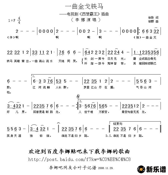 李娜演唱的一曲金戈铁马(电视剧《西楚霸王》插曲)歌词,一曲金戈铁马(电视剧《西楚霸王》插曲)简谱.