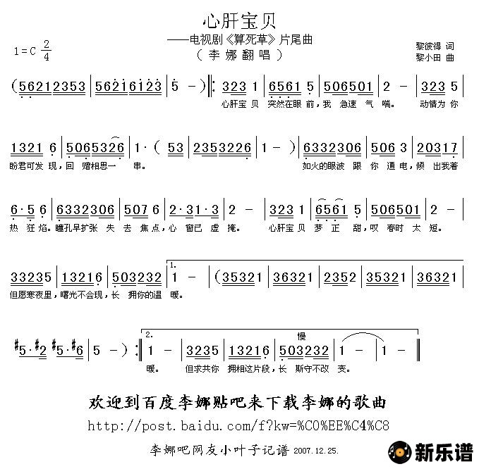 李娜演唱的心肝宝贝(电视剧《算死草》片尾曲)歌词,心肝宝贝(电视剧《算死草》片尾曲)简谱.