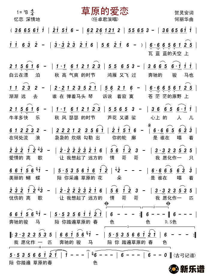 《草原的爱恋》简谱 任卓君-古弓制谱