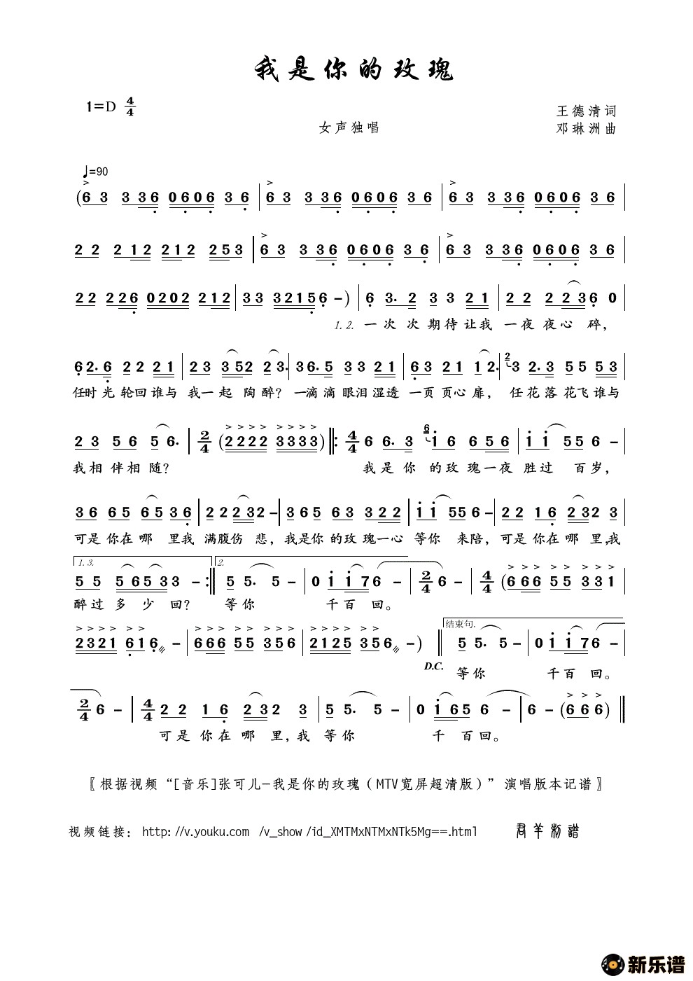 《我是你的玫瑰》简谱 张可儿-君羊制谱