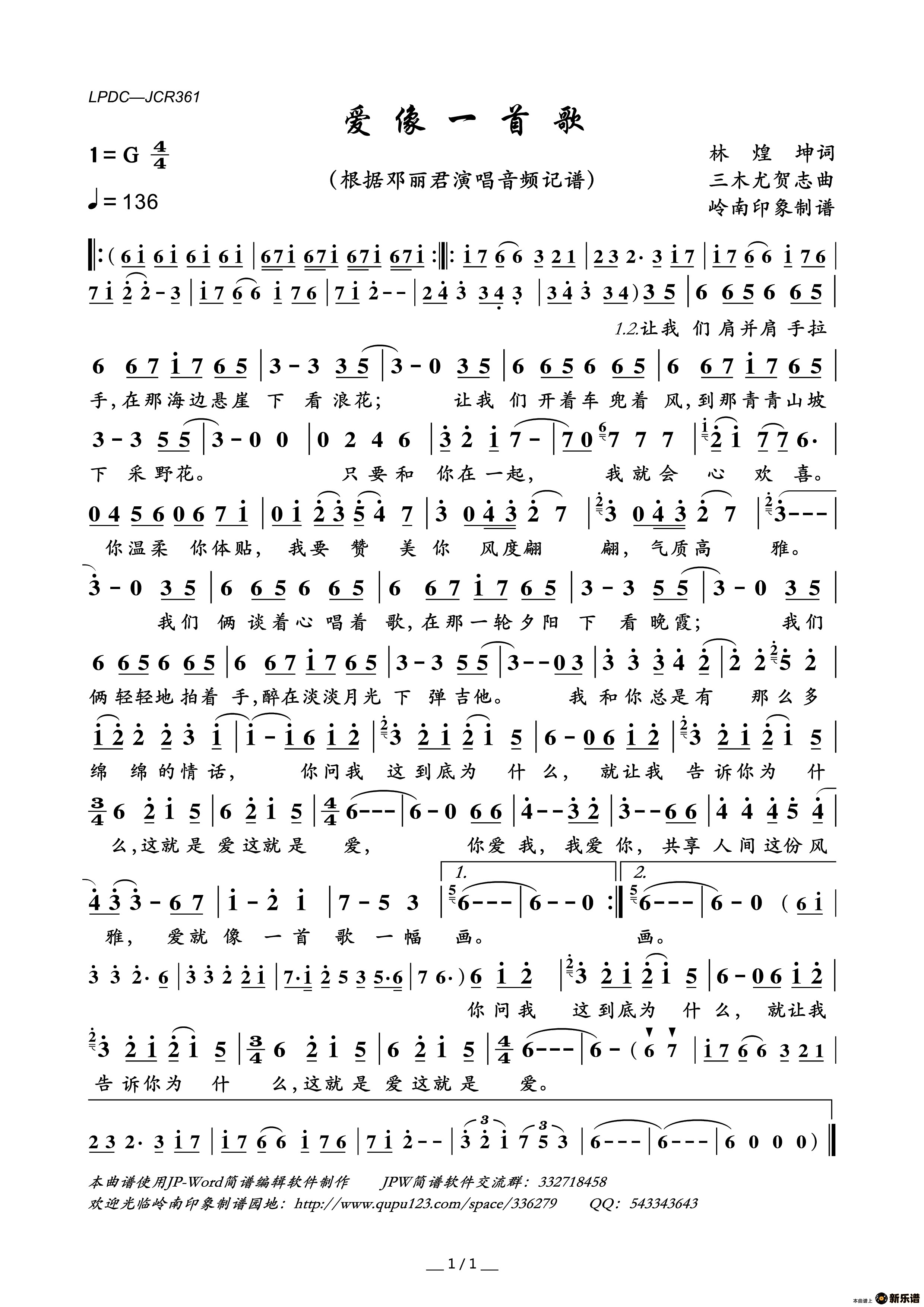 《爱 像一首歌》简谱 邓丽君-岭南印象制谱