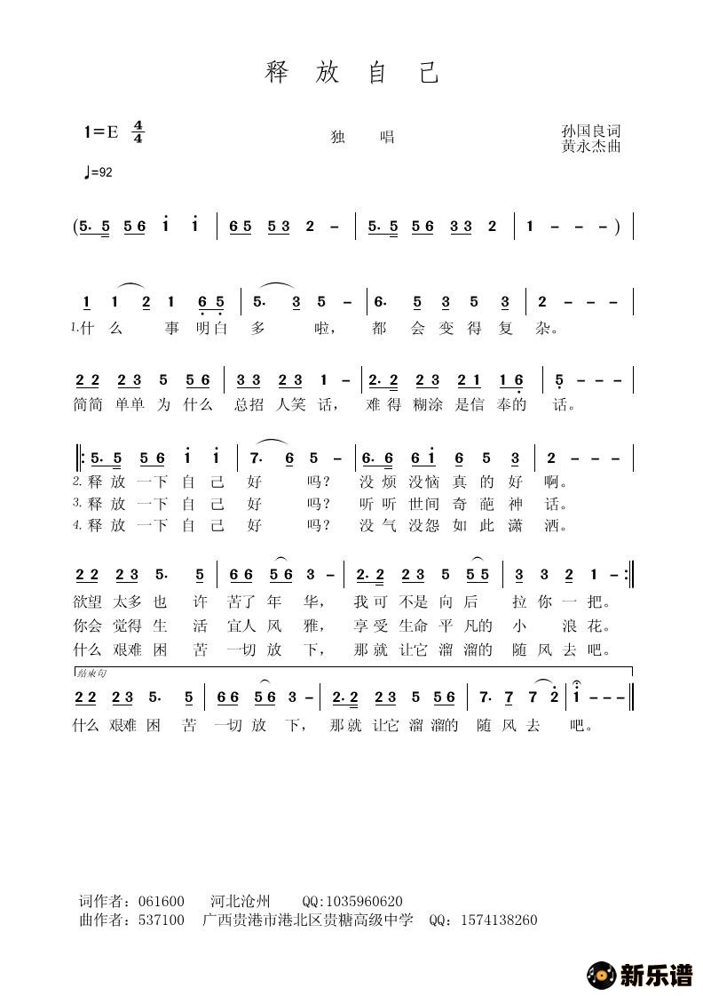 演唱的释放自己歌词,释放自己简谱.