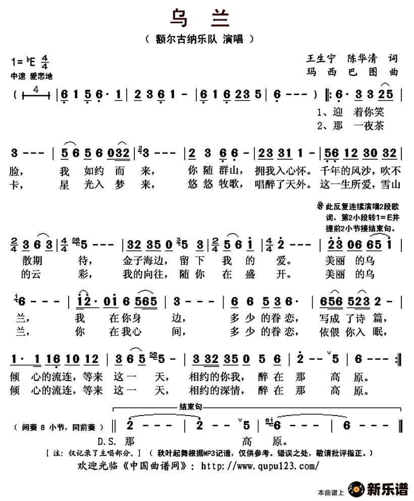 额尔古纳乐队演唱的乌 兰歌词,乌 兰简谱.