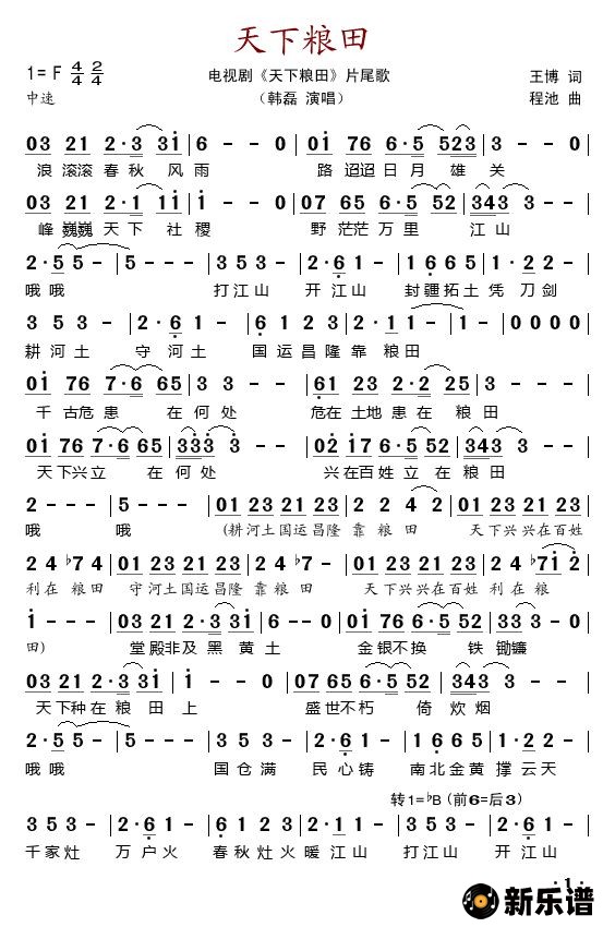 韩磊演唱的天下粮田(电视剧《天下粮田》片尾歌)歌词,天下粮田(电视剧《天下粮田》片尾歌)简谱.