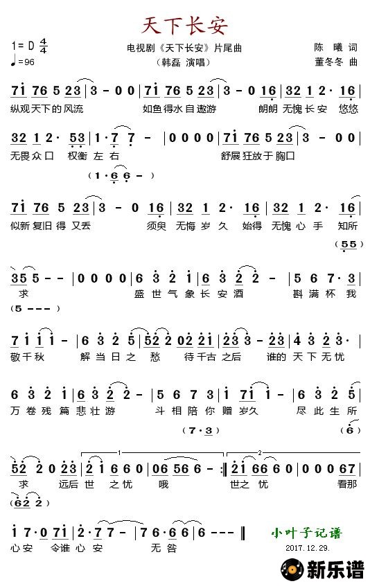 《天下长安(电视剧《天下长安》片尾曲)》简谱 韩磊-小叶子制谱
