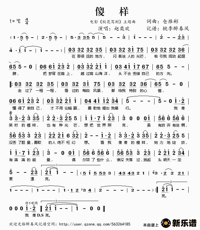 傻样(电影《校花驾到》主题曲)赵奕欢 赵奕欢演唱的傻样(电影《校花驾到》主题曲)歌词,傻样(电影《校花驾到》主题曲)简谱. 傻样演 唱:赵奕欢词/曲:仓雁彬在那很远的地方闪着迷人的光芒吸引我挥动起翅膀把梦背在肩上越过高山海洋从不会丢掉自己的方向走过了一程一程看过的每段风景都给我特别的心情懂得了做自己才不用论输赢勇敢地唱出我最行我傻笑时的模样也有种光芒想把世界照亮虽有放弃有迷惘没丢了胆量勇敢的人绝不枉幻想看我傻傻的模样努力地绽放有满满的能量偶尔哭了怕什么谁没失落过扬起头明天一定更漂亮此简谱由新乐谱会员 桃李醉春风 上传