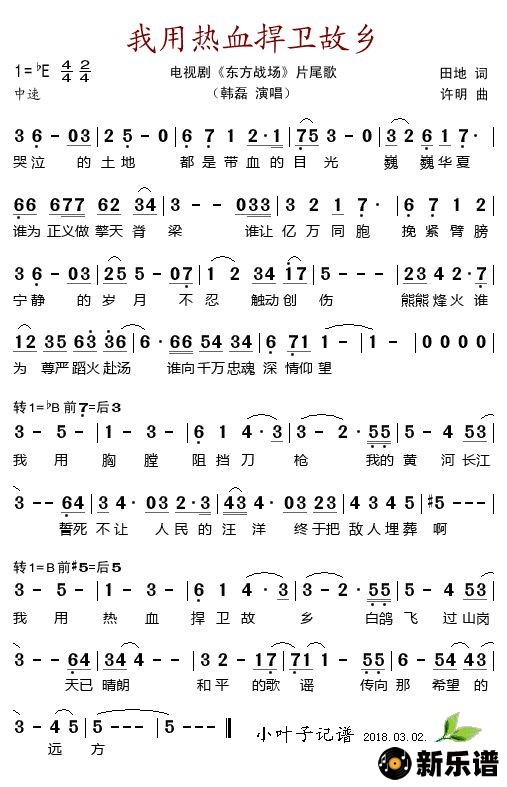 《我用热血捍卫故乡(电视剧《东方战场》片尾歌)》简谱 韩磊-小叶子制谱