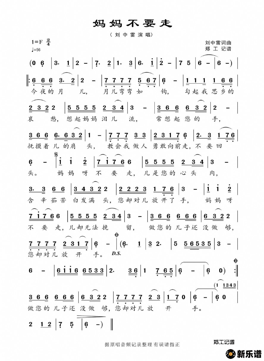 《妈妈不要走》简谱 刘中雷-郑工制谱