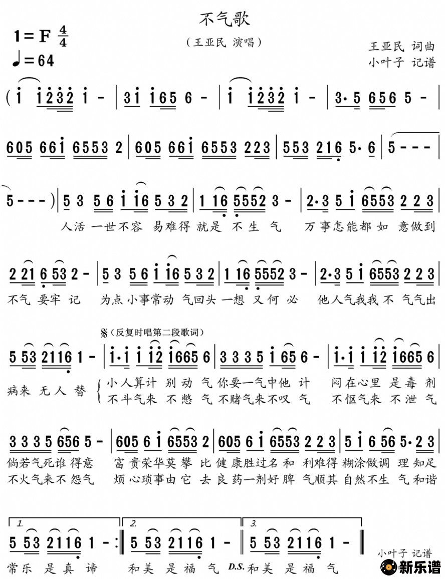 王亚民演唱的不气歌歌词,不气歌简谱.
