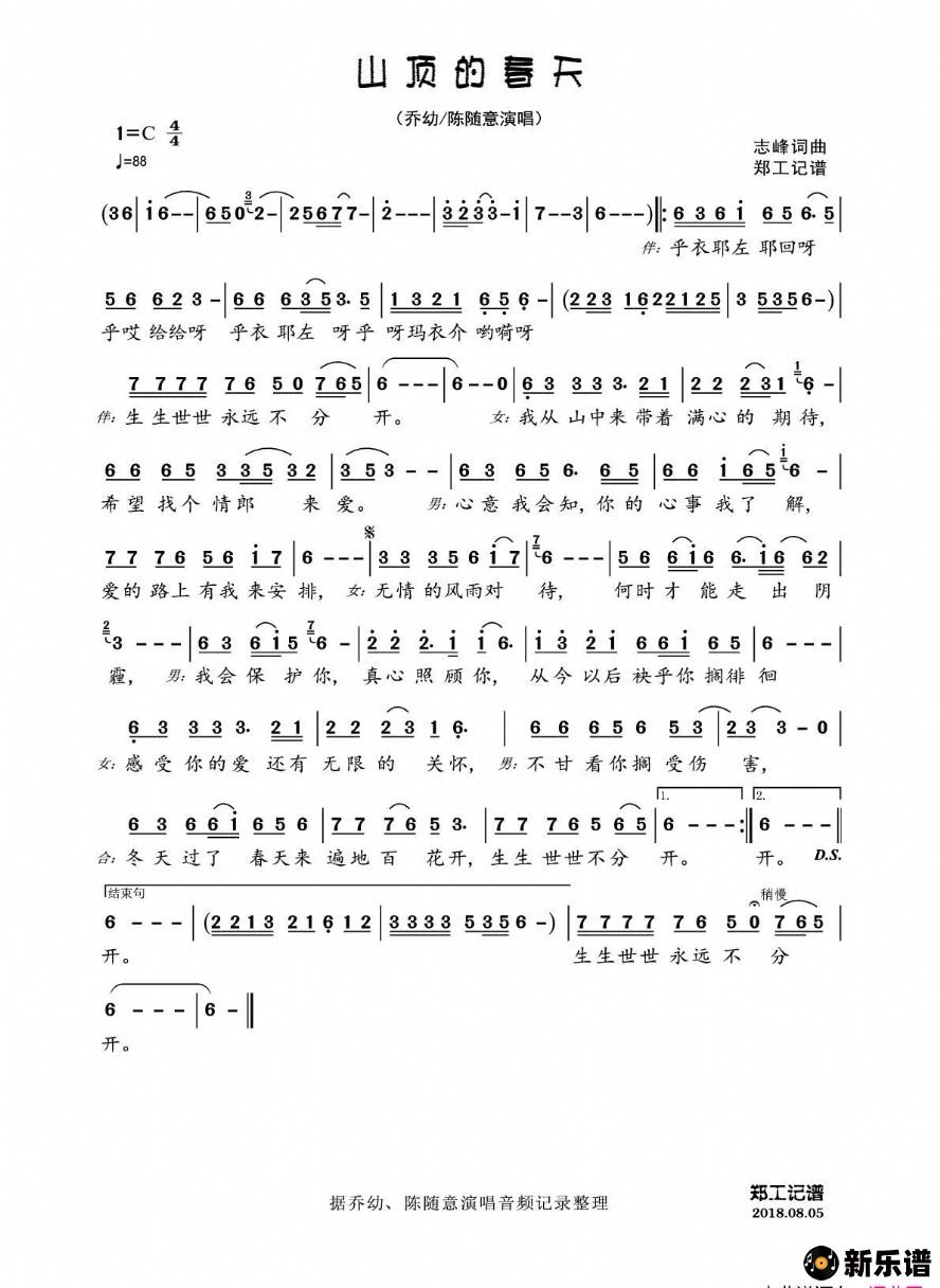 乔幼演唱的山顶的春天歌词,山顶的春天简谱.