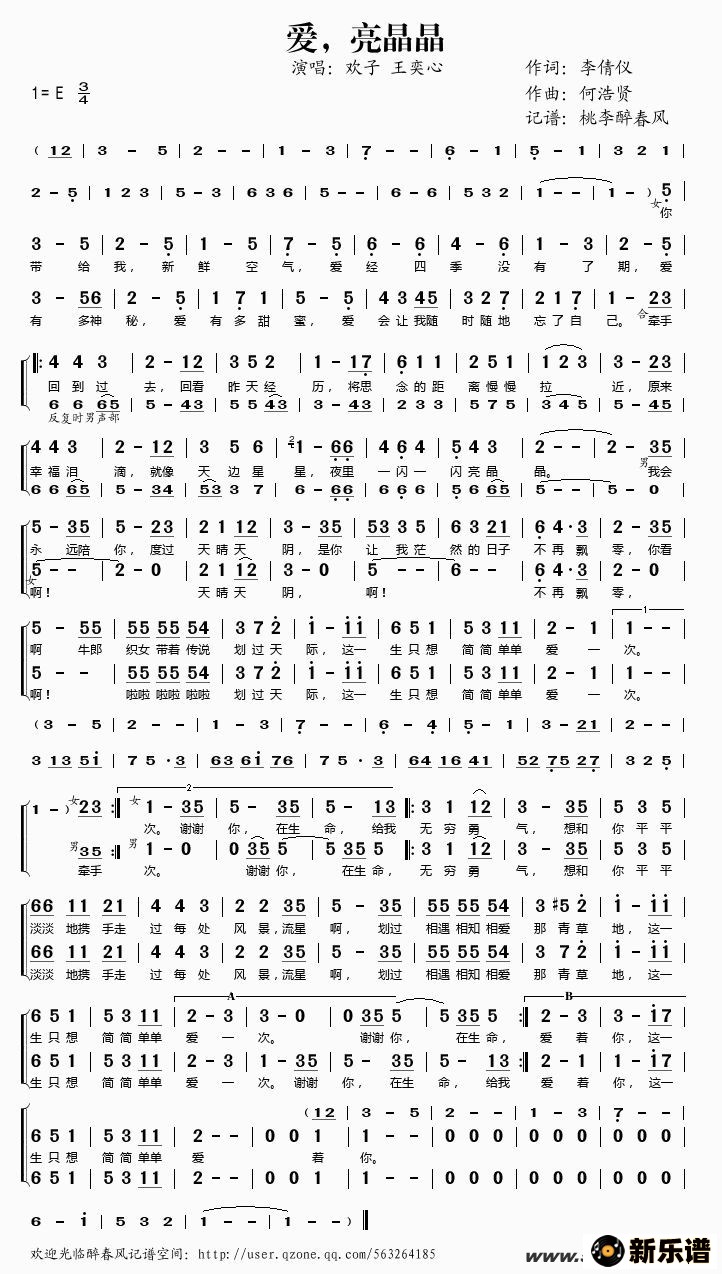 欢子/王奕心演唱的爱,亮晶晶歌词,爱,亮晶晶简谱.