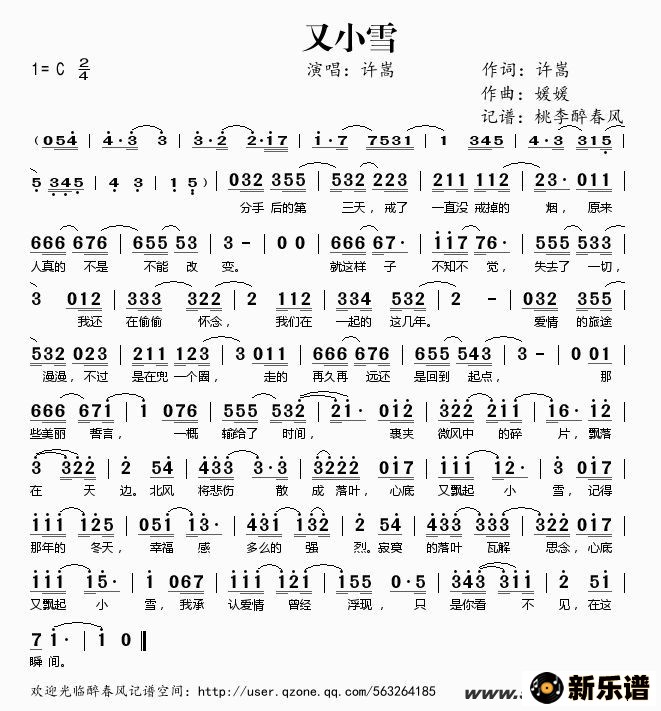 许嵩演唱的又小雪歌词,又小雪简谱.