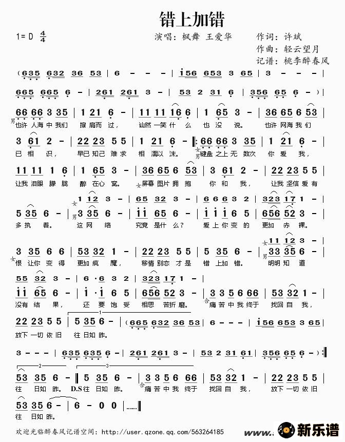 《错上加错》简谱 枫舞/王爱华-桃李醉春风制谱