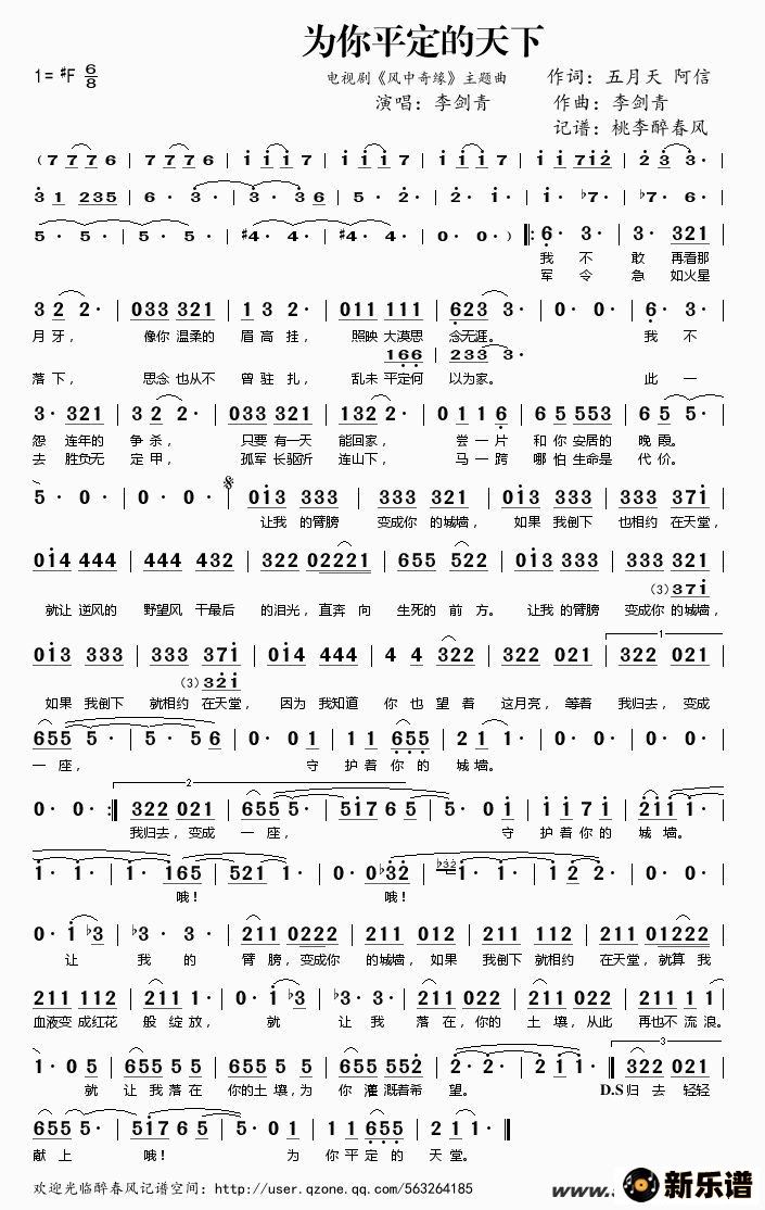 李剑青演唱的为你平定的天下(电视剧《风中奇缘》主题曲)歌词,为你平定的天下(电视剧《风中奇缘》主题曲)简谱.