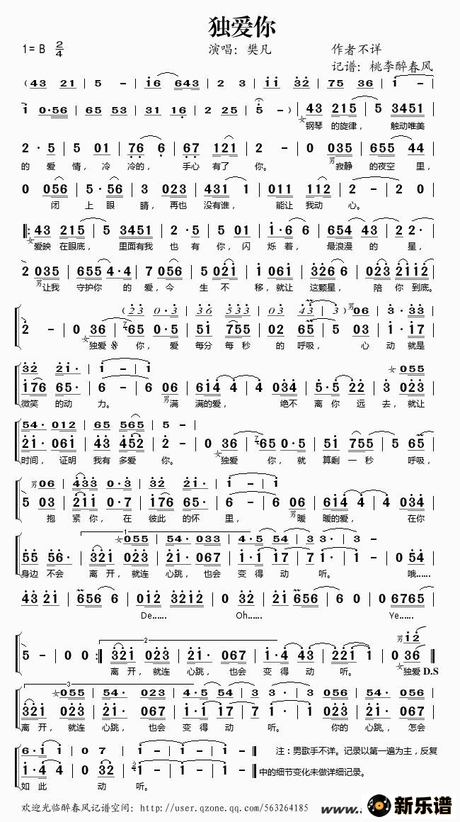 《独爱你》简谱 樊凡-桃李醉春风制谱