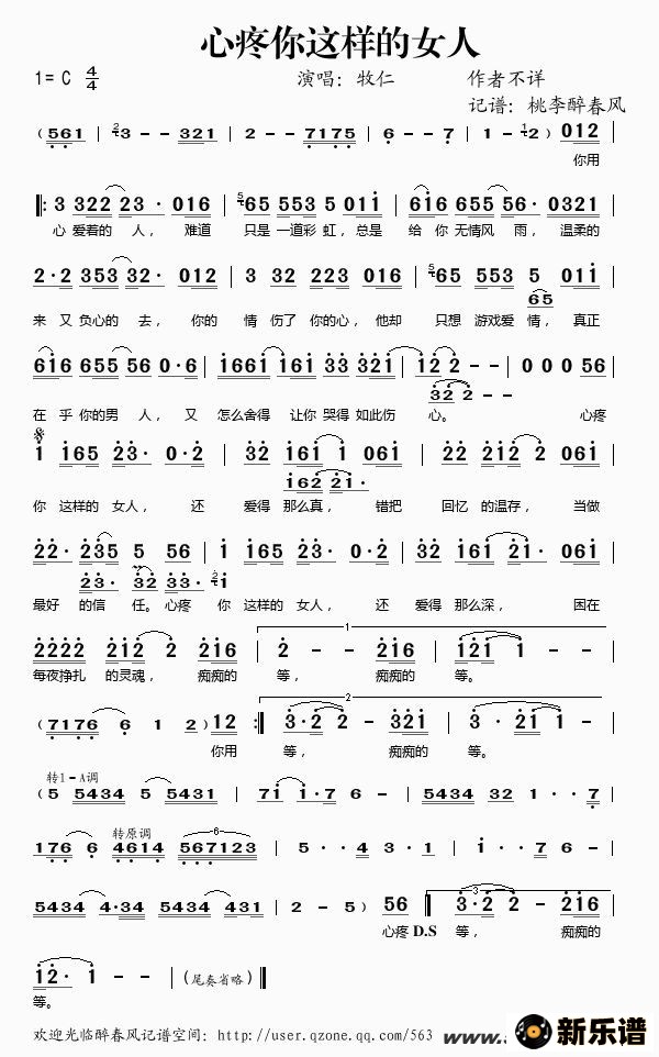 《心疼你这样的女人》简谱 牧仁-桃李醉春风制谱