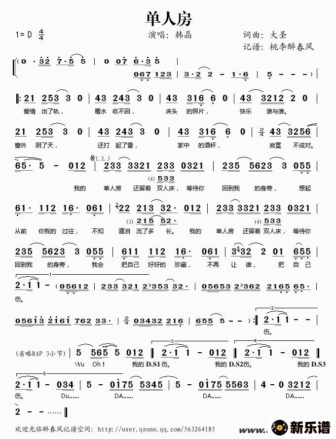 《单人房》简谱 韩晶-桃李醉春风制谱