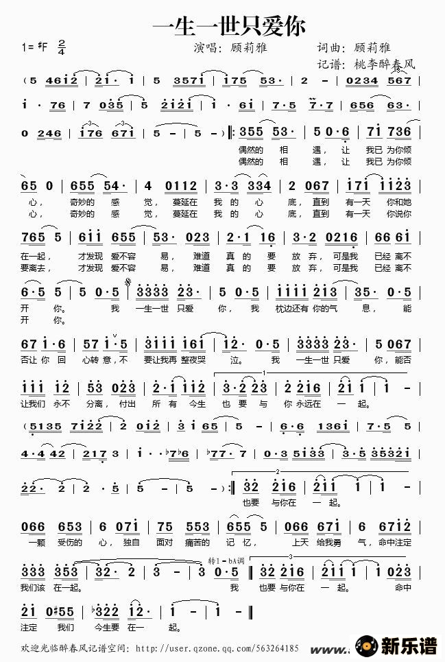 《一生一世只爱你》简谱 顾莉雅-桃李醉春风制谱