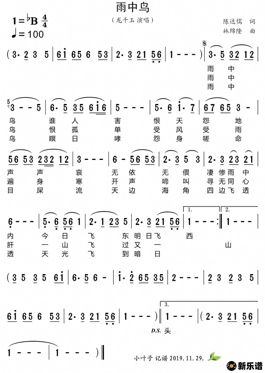 《雨中鸟》简谱 龙千玉-小叶子制谱