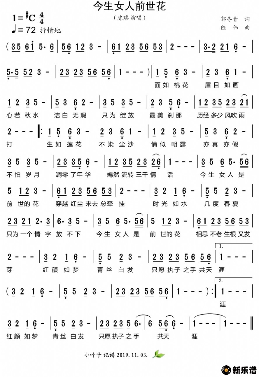 《今生女人前世花》简谱 陈瑞-小叶子制谱
