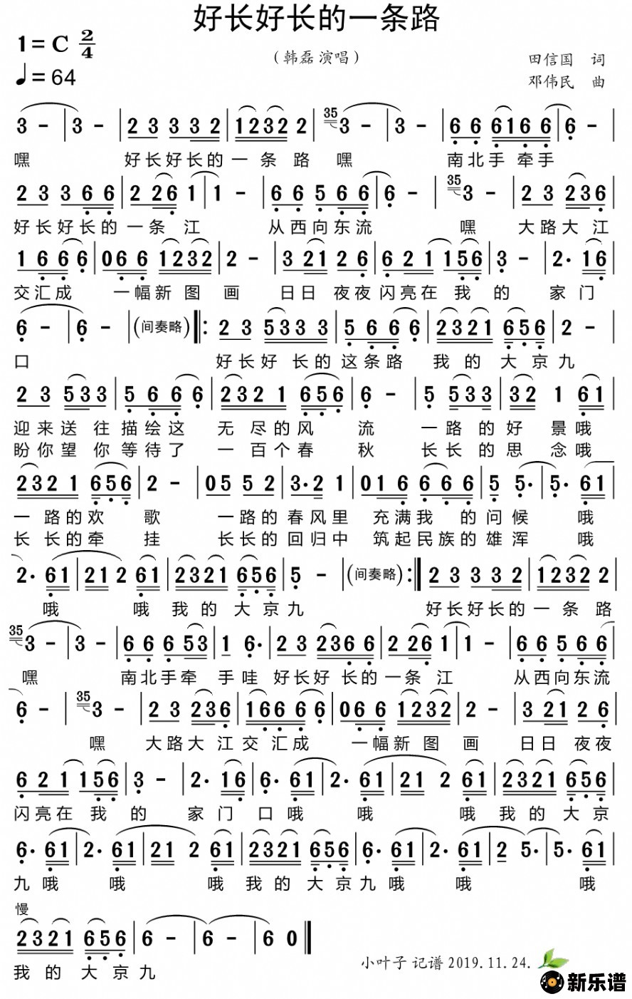 《好长好长的一条路》简谱 韩磊-小叶子制谱