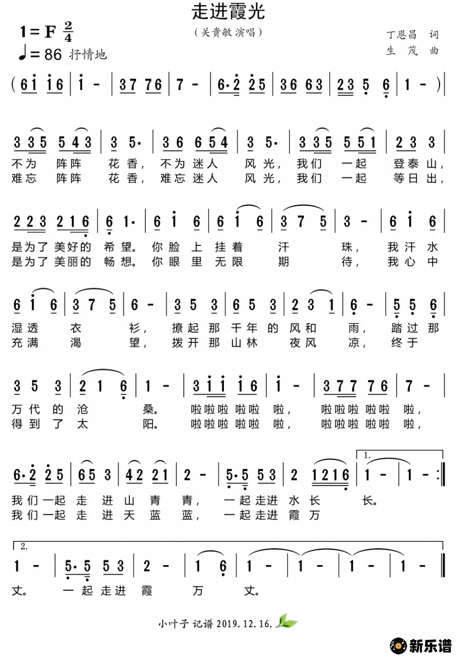 《走进霞光》简谱 关贵敏-小叶子制谱