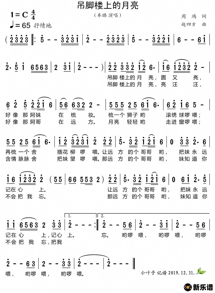 《吊脚楼上的月亮》简谱 车璐-小叶子制谱