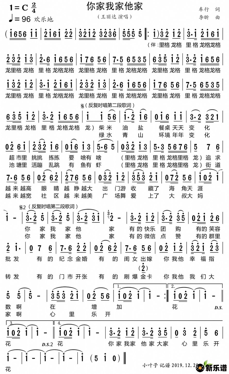 王丽达演唱的你家我家他家歌词,你家我家他家简谱.