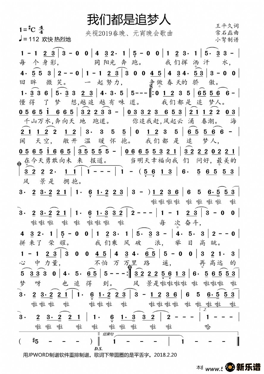 演唱的我们都是追梦人(央视2019春晚、元宵晚会歌曲)歌词,我们都是追梦人(央视2019春晚、元宵晚会歌曲)简谱.