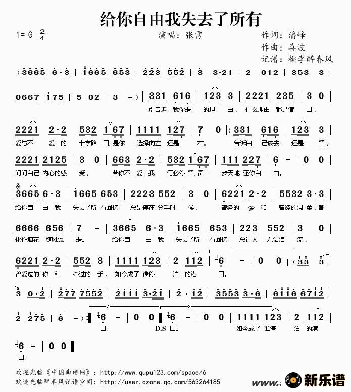 《给你自由我失去了所有》简谱 张雷-桃李醉春风制谱