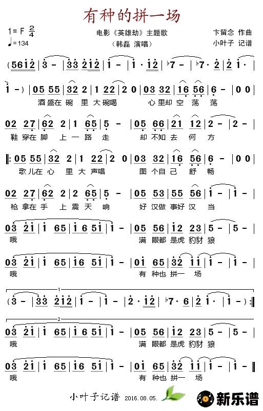 《有种的拼一场(电影《英雄劫》主题歌)》简谱 韩磊-小叶子制谱