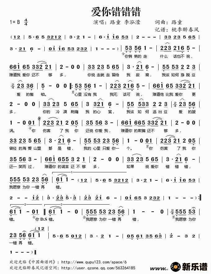 《爱你错错错》简谱 路童/李泓滢-桃李醉春风制谱