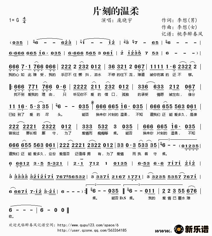 《片刻的温柔》简谱 庞晓宇-桃李醉春风制谱