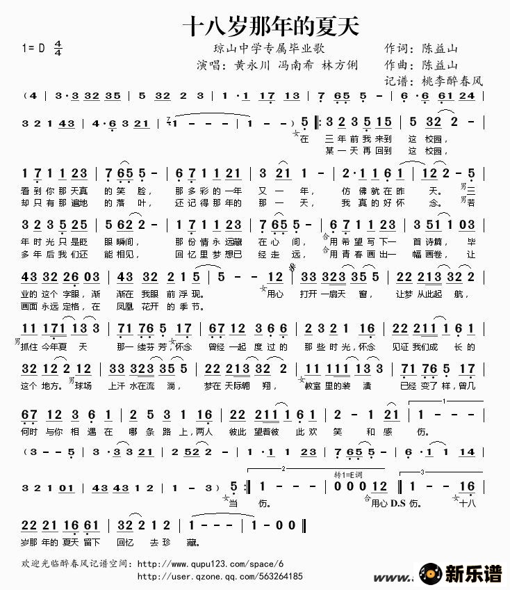 《十八岁那年的夏天》简谱 黄永川/冯南希/林方俐-桃李醉春风制谱