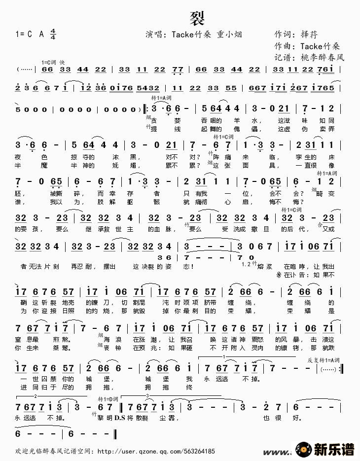 Tacke竹桑/重小烟演唱的裂歌词,裂简谱.