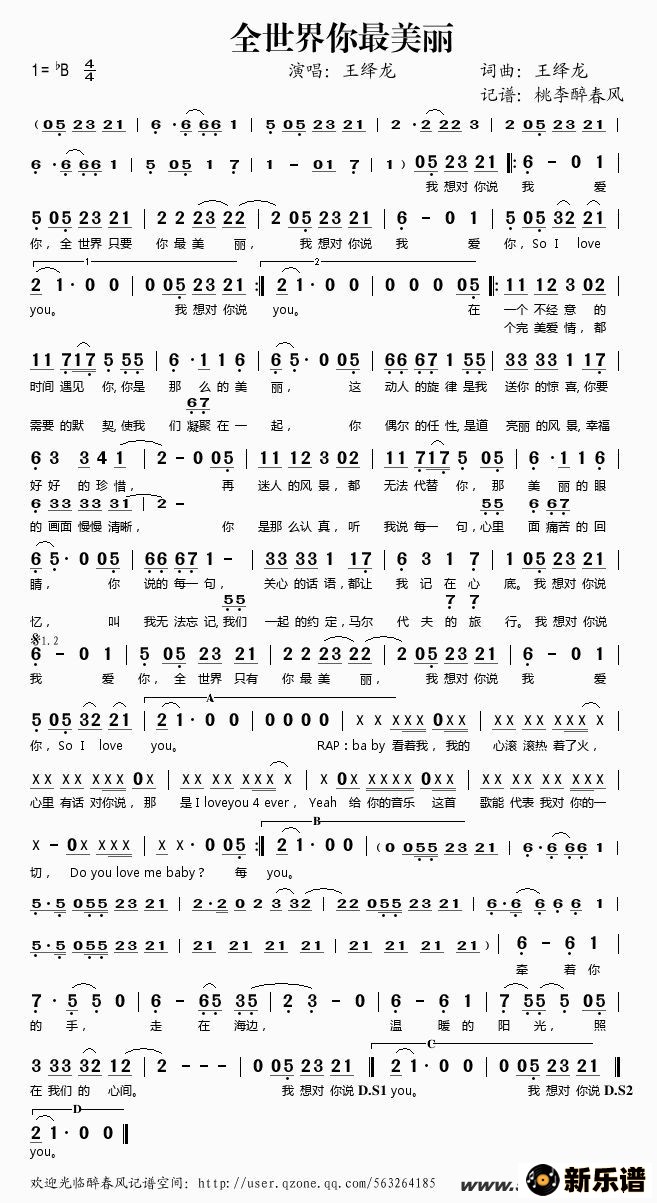 王绎龙演唱的全世界你最美丽歌词,全世界你最美丽简谱.