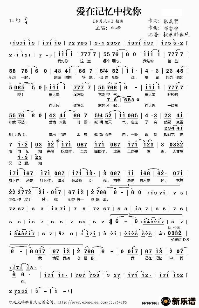 《爱在记忆中找你(《岁月风云》插曲)》简谱 林峰-桃李醉春风制谱