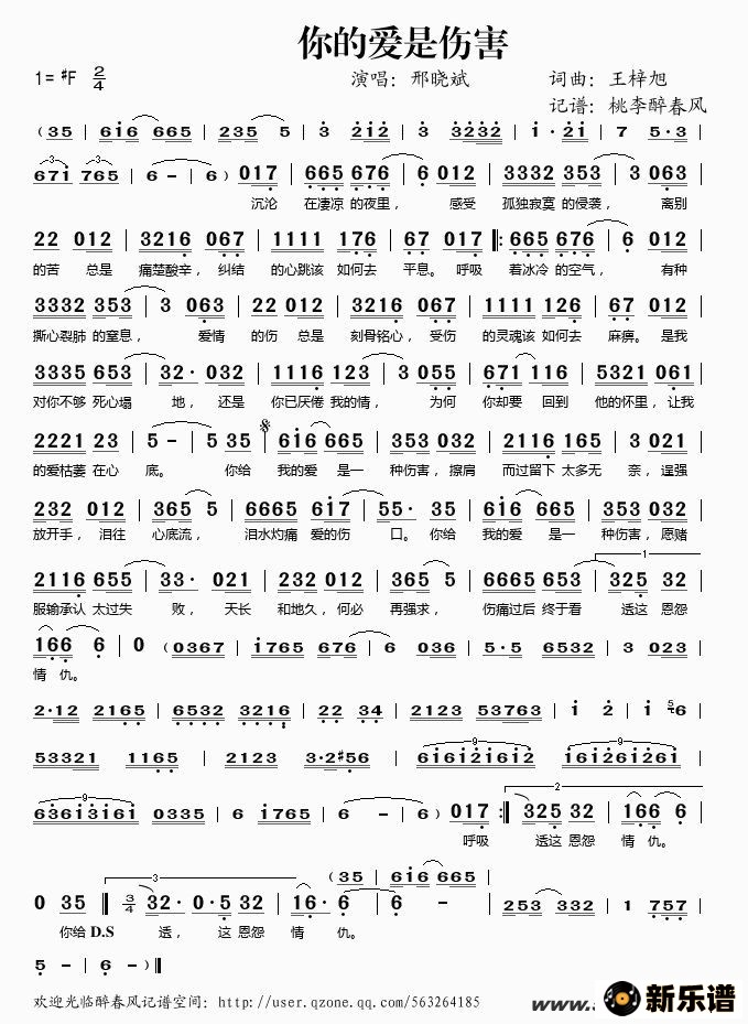 《你的爱是伤害》简谱 邢晓斌-桃李醉春风制谱