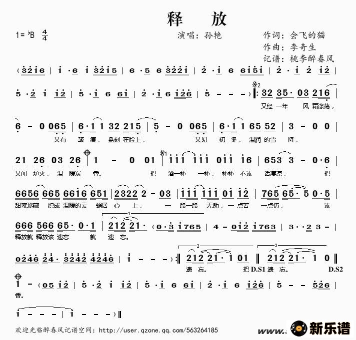 孙艳演唱的释放歌词,释放简谱.