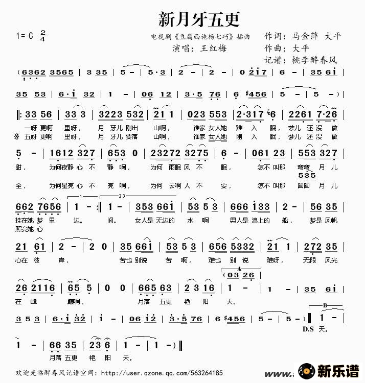 《新月牙五更(电视剧《豆腐西施杨七巧》插曲)》简谱 王红梅-桃李醉春风制谱