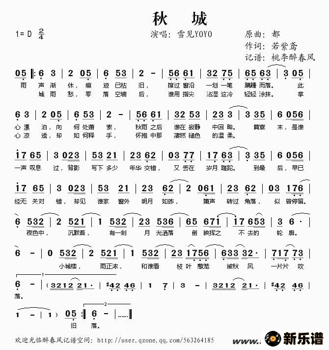 雪见YOYO演唱的秋城歌词,秋城简谱.