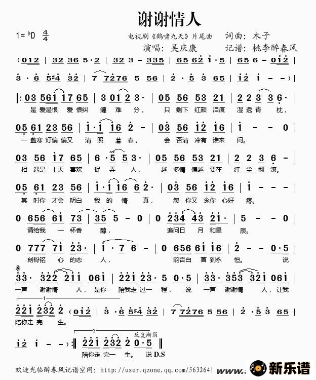 《谢谢情人(新加坡电视剧《鹤啸九天》片尾曲)》简谱 吴庆康-桃李醉春风制谱
