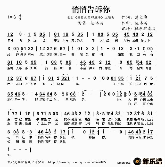 范玮琪演唱的悄悄告诉你(电影《被偷走的那五年》主题曲)歌词,悄悄告诉你(电影《被偷走的那五年》主题曲)简谱.