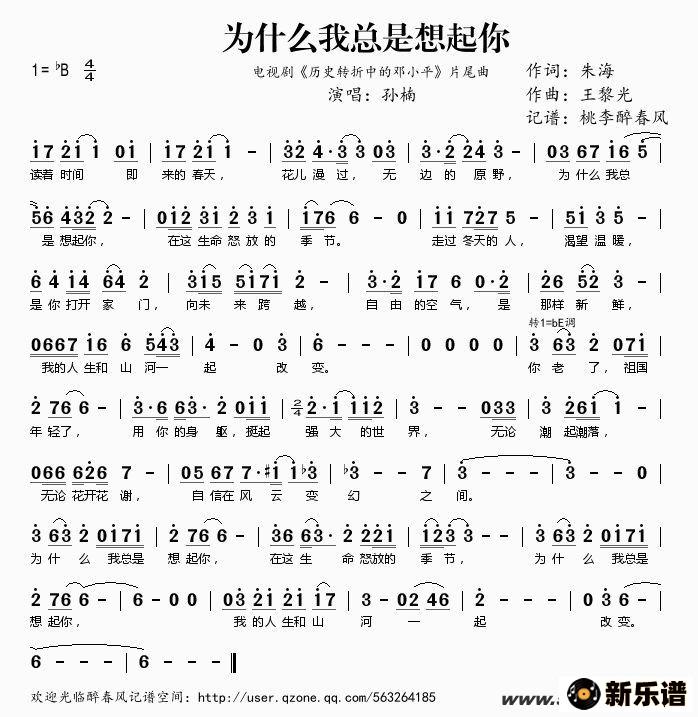为什么我总是想起你(电视剧《历史转折中的邓小平》片尾曲)孙楠 孙楠演唱的为什么我总是想起你(电视剧《历史转折中的邓小平》片尾曲)歌词,为什么我总是想起你(电视剧《历史转折中的邓小平》片尾曲)简谱. 此简谱由新乐谱会员 桃李醉春风 上传
