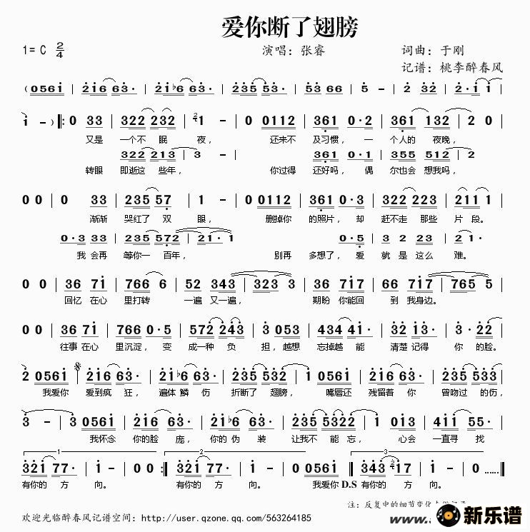 张睿演唱的爱你断了翅膀歌词,爱你断了翅膀简谱.