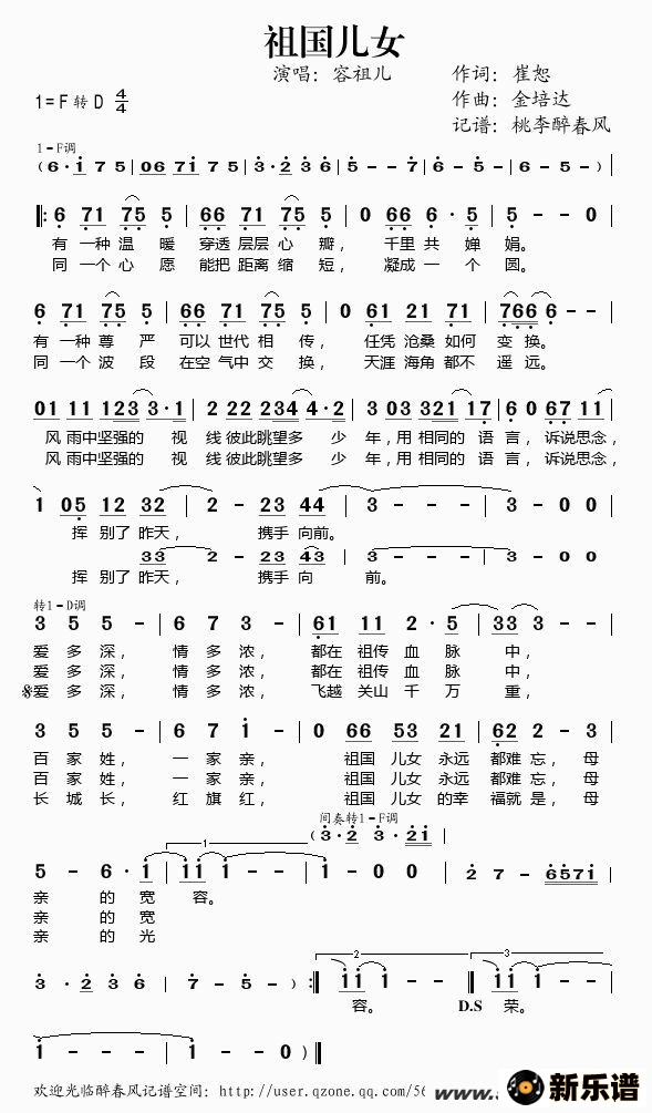 容祖儿演唱的祖国儿女歌词,祖国儿女简谱.