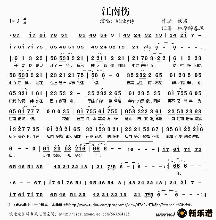 《江南伤》简谱 Winky诗-桃李醉春风制谱
