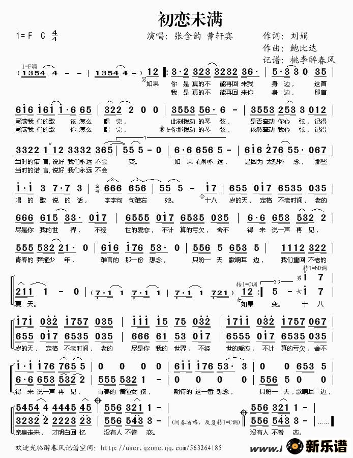 初恋未满/张含韵 曹轩宾 相关曲谱